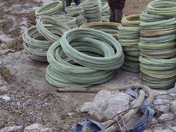3、由于玻璃纖維樹脂筋材在生產時采用的是熱固性樹脂制作,成形之后在施工現(xiàn)場很難改變其形狀,為了保證玻璃纖維鋼筋籠的順利下放,可以利用10#(3.5㎜)鍍鋅鐵線將籠底的玻璃纖維主筋綁扎,起到收口的效果。