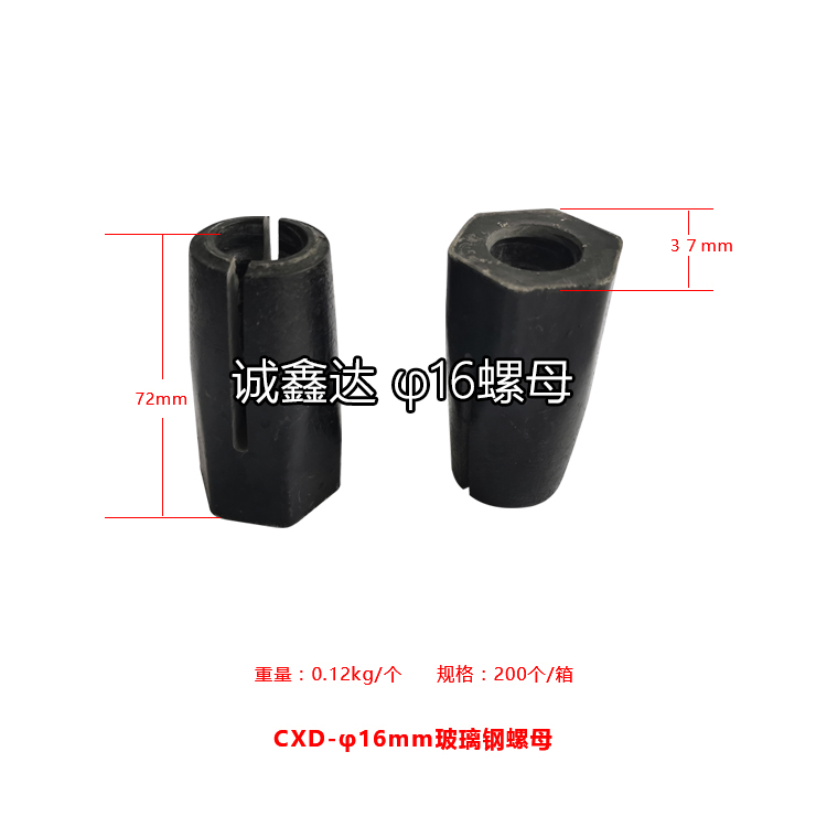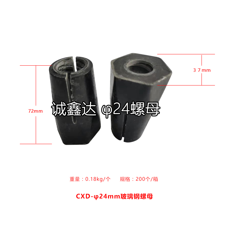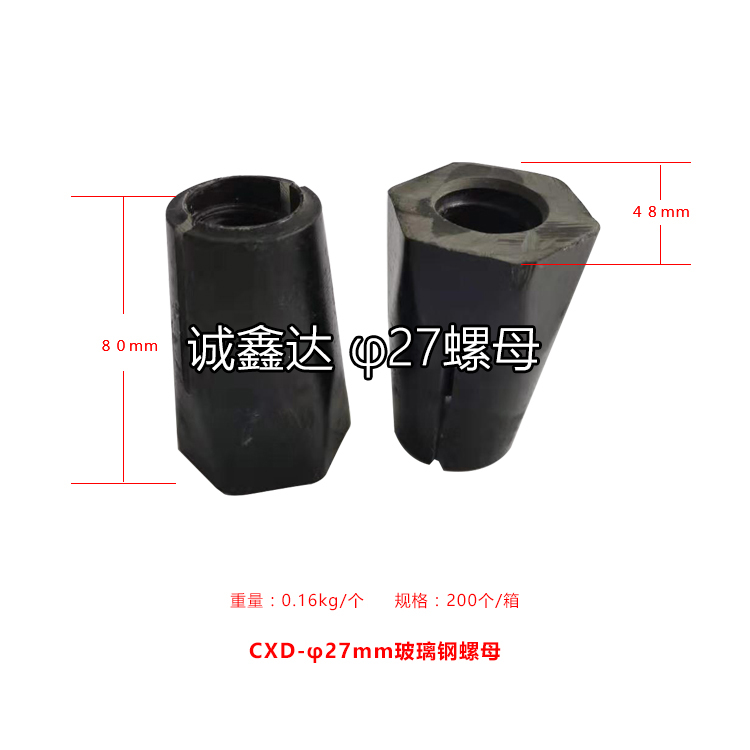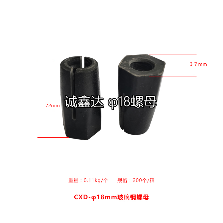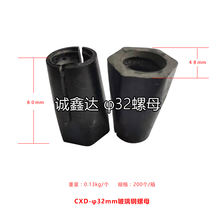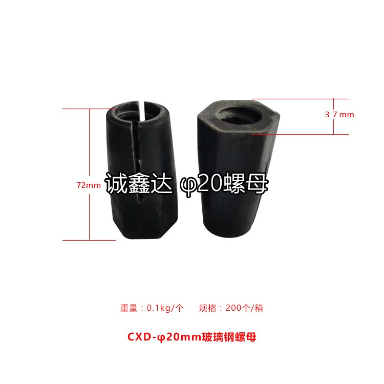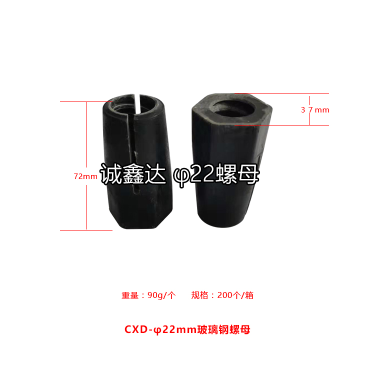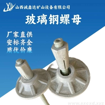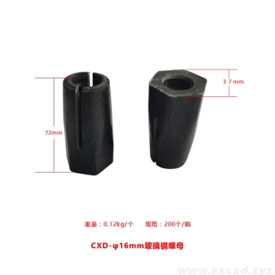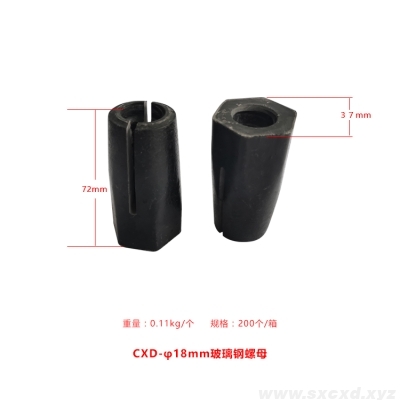 作為礦山支護配件,山西誠鑫達研發(fā)了一種高抗拉強度的玻璃鋼螺母,螺母本體開有內螺紋孔,在內螺紋孔孔壁設螺紋,螺母本體的前部分外形為錐形且用于與托盤緊密配合,在螺母本體的前部分的錐形面開設有通槽,螺紋孔的前部呈喇叭形,這樣螺紋孔的前端直徑大于后端的直徑,進入托盤錐形孔后,螺母本體的前端和中部同時收縮,使螺母本體的內螺紋與錨桿外螺紋緊密配合,拉緊長度增加到25mm—30mm,擴散了應力,使抗拉強度明顯提高。