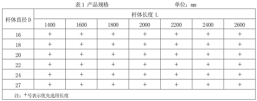示例:公稱直徑為20mm,長度為1800mm,桿體尾部結(jié)構(gòu)為非金屬材料的全螺紋式樹脂錨桿玻璃纖維增強(qiáng)塑料桿體,可標(biāo)記為MGSL20/1800F。