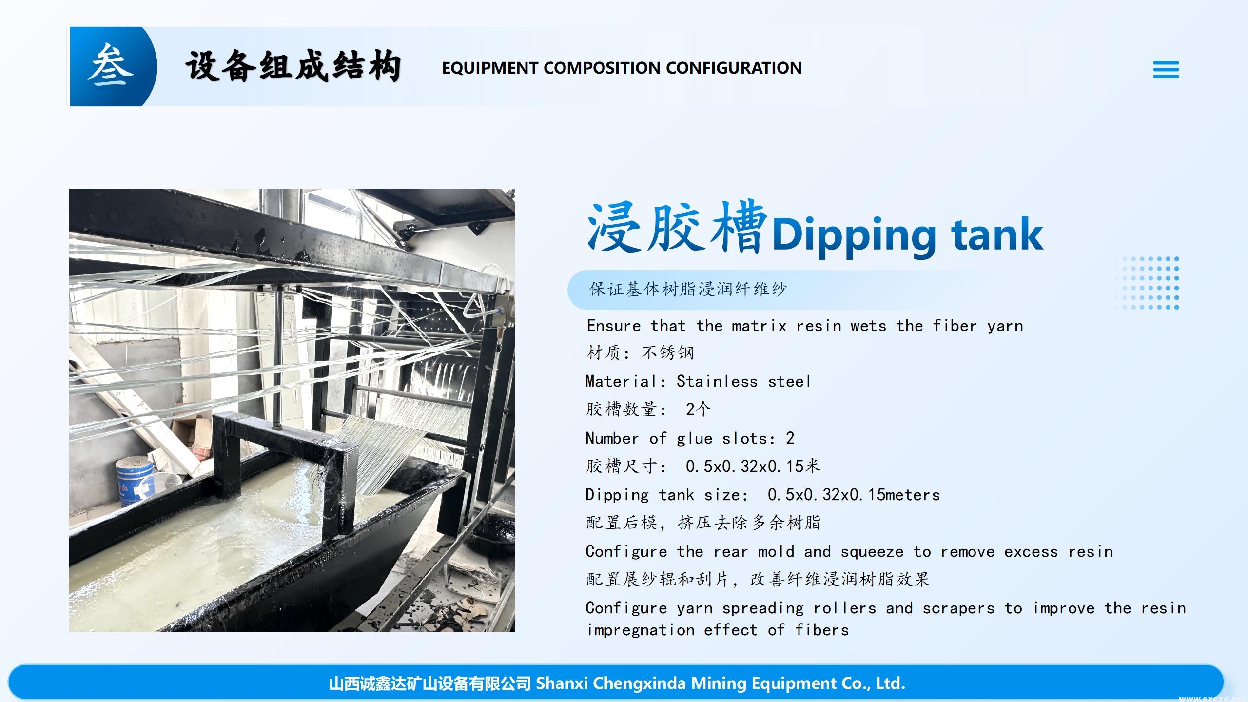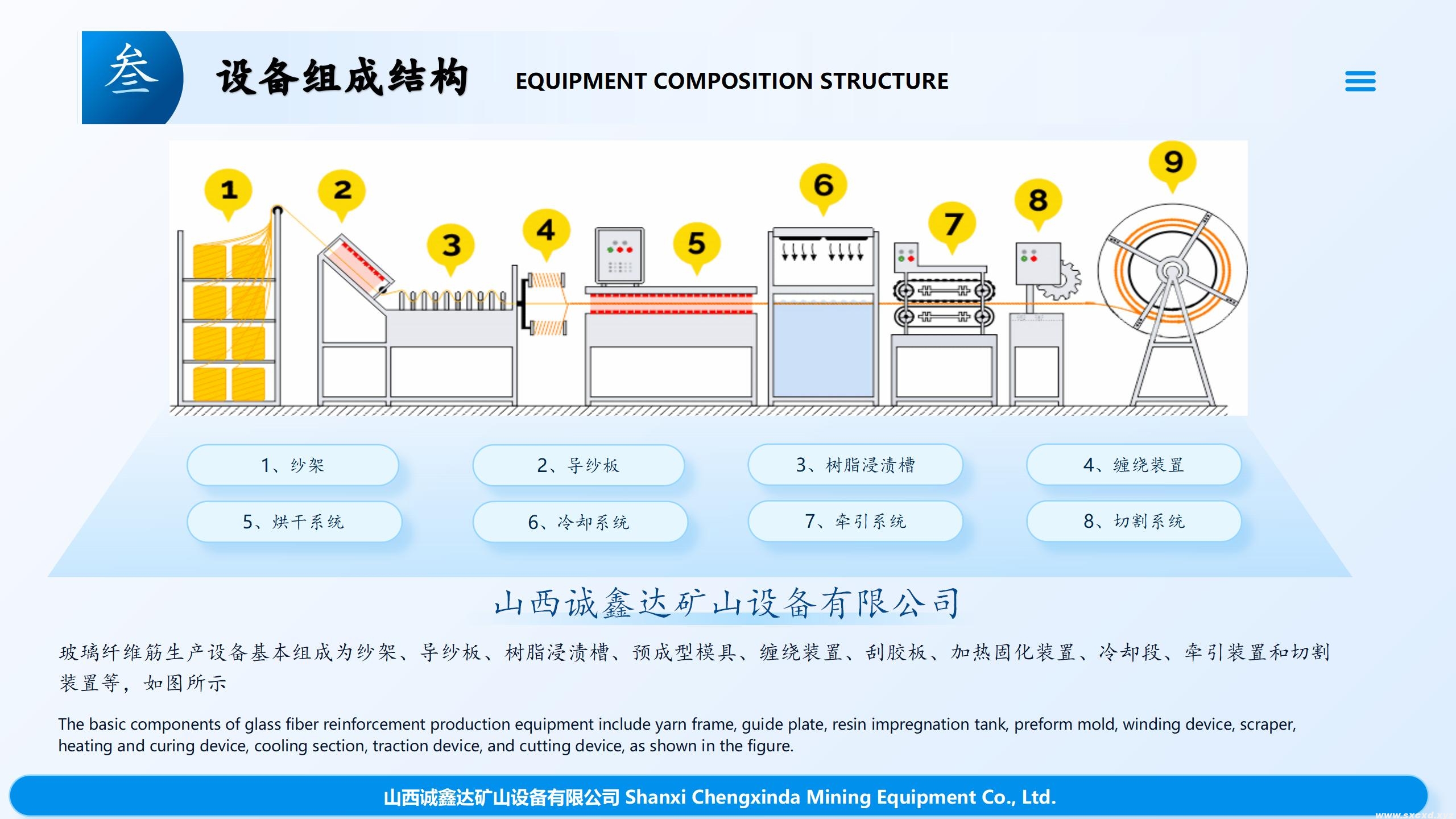 放在紗架上的玻璃纖維紗由于尾部牽引系統(tǒng)的作用,通過過絲板,送到了浸料槽,進(jìn)料槽內(nèi)有樹脂,玻璃纖維紗在進(jìn)料槽內(nèi)浸滿了樹脂,然后在通過預(yù)成型系統(tǒng)合攏成束,在模具內(nèi)經(jīng)過加熱器加熱熔融,通過液壓系統(tǒng)擠壓成型,在通過纏繞系統(tǒng),成為全螺紋玻璃纖維塑料杠體,(在進(jìn)料槽、預(yù)成型系統(tǒng)、纏繞系統(tǒng)前端有硅膠片,作用是保證桿體光滑,無氣泡)然后進(jìn)入烘干系統(tǒng)進(jìn)行固化,經(jīng)過切割組件將桿體切割成所需要的長度,經(jīng)過品管員的檢驗(yàn),入庫。